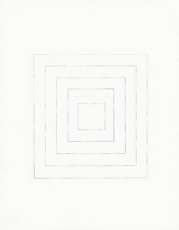 동심 직사각형이 서로 안에 포개지며, 각각 약간 회전하여 순수한 선의 소용돌이 와류를 만든다. 프랭크 스텔라의 미니멀리즘 회화가 명상적 실천으로 — 드로잉의 체계적 노동이 가시화된다.
