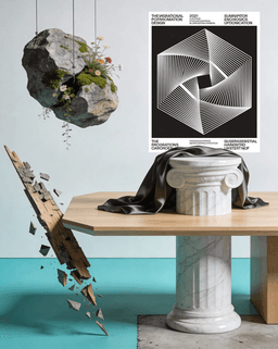 A surreal still life that refuses to sit still. A floating boulder cradles wildflowers, a shattered timber defies the marble column, and a geometric poster presides over the impossible arrangement. Every object contradicts the next — that is the point.
